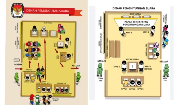 Adapun pengaturan denah TPS Pemilu 2024 akan mencakup penataan letak saat proses pencoblosan dan penghitungan suara setelah pemilihan.