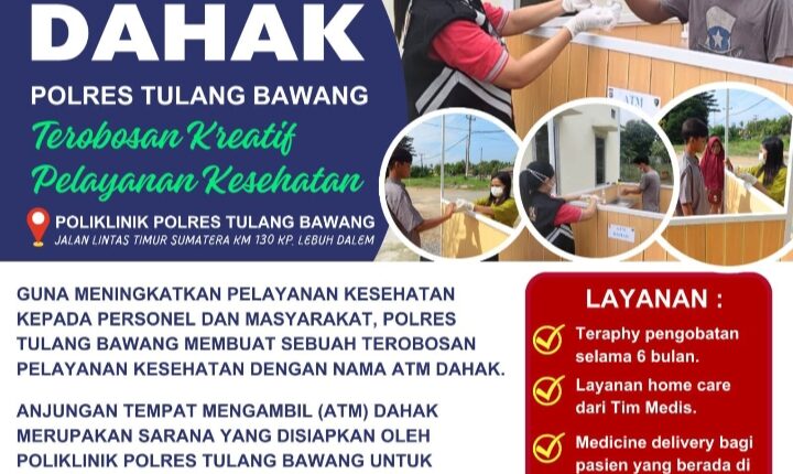 ATM Dahak, yang merupakan singkatan dari Anjungan Tempat Mengambil Dahak, adalah fasilitas yang disiapkan oleh Poliklinik Polres Tulang Bawang.