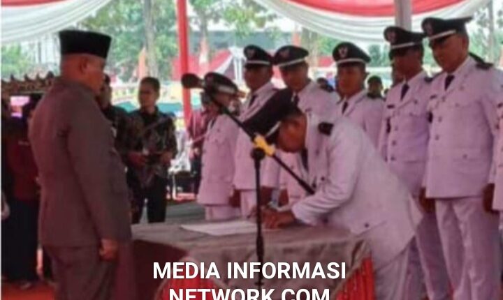 Natar Lampung Selatan – Bupati Lampung Selatan H.Nanang Ermanto menandatangani penyerahan Surat Keputusan (SK) sekaligus mengukuhkan Perpanjangan masa jabatan Kepala Desa (Kades) Se Kecamatan Natar Kabupaten Lampung Selatan yang berlangsung di Lapangan Dusun Dwi Dharma Desa Negara Ratu Kecamatan Natar.