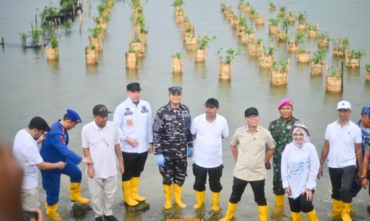 Pesawaran (MI-NET) – Pemerintah Provinsi Lampung bekerja sama dengan Pemerintah Kabupaten Pesawaran dan juga pelaku usaha sektor perikanan dan kelautan dalam upaya mendorong perbaikan ekosistem di wilayah pesisir. Upaya ini diwujudkan melalui kegiatan Rehabilitasi Ekosistem Pesisir Penanaman Mangrove dan Pemasangan Approstrap yang dilaksanakan di Tambak PT. Indocom Samudra Persada, Desa Gebang Kecamatan Teluk Pandan, Pesawaran Kamis, (8/5/2025).
