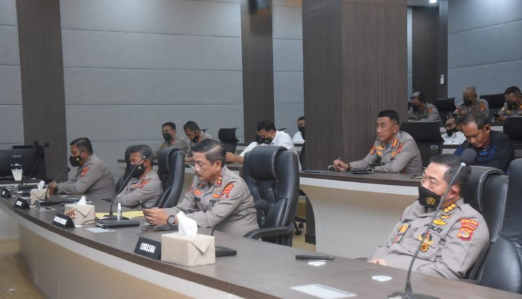 BANDAR LAMPUNG (MIN-SMSI) – Kapolda Lampung Irjen Pol Hendro Sugiatno didampingi Wakapolda Lampung Brigjen Pol Subiyanto, irwasda dan pejabat utama Polda Lampung, menghadiri rapat internal pimpinan Wakapolri, di ruang vicon Mapolda Lampung, Senin (18/4/2022).