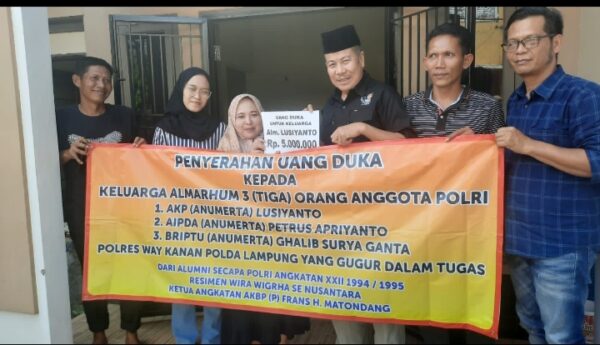 Kali ini, bentuk empati dan solidaritas datang dari Alumni SECAPA Polri angkatan XXII 1994/1995 Resimen Wira Wighra se-Nusantara. Melalui perwakilannya, mereka mengunjungi kediaman saudara istri almarhum AKP. (Anumerta) Lusiyanto di Desa Way Huwi Lampung Selatan dan kediaman Almarhum Briptu (Anumerta) Ghalib Surya Ganta di Kelurahan Tanjung Senang Kota Bandar Lampung. Kunjungan tersebut sebagai bentuk silaturahmi sekaligus penyerahan santunan dari alumni Scapa 94/95 Nusantara se-Indonesia, pada Rabu (09/4/2025).