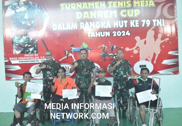 Lampung – Sebanyak 31 orang atlet tenis meja dan 32 orang atlet bulu tangkis disabilitas, turut ambil bagian meriahkan Turnamen Danrem Cup dalam rangka HUT Ke-79 TNI Tahun 2024. Sabtu (14/09/2024).