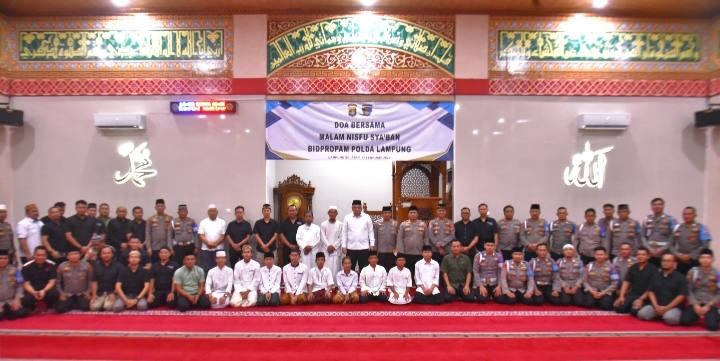 Lampung (MI-NET) – Bid Propam Polda Lampung menggelar kegiatan doa bersama malam Nisfu Sya’ban di Masjid Al-Ikhlas Polda Lampung. Doa bersama ini juga turut dilaksanakan serentak oleh Polres/Ta Jajaran Polda Lampung, pada Kamis (13/2/2025).