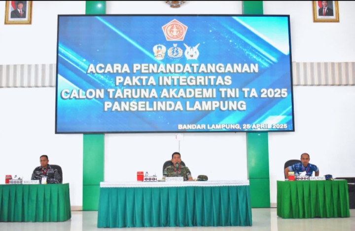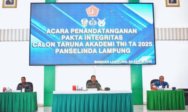 Lampung (MI-NET) – Komandan Korem 043/Gatam Brigjen TNI Rikas Hidayatullah, S.E., M.M., memimpin acara Penandatanganan Pakta Integritas Calon Taruna (Catar) Akademi TNI Tahun Akademik 2025. Acara yang diinisiasi oleh Panitia Seleksi Daerah (Paselinda) Lampung ini dilaksanakan di Aula Sudirman, Makorem 043/Gatam, pada Jumat (25/4/2025).