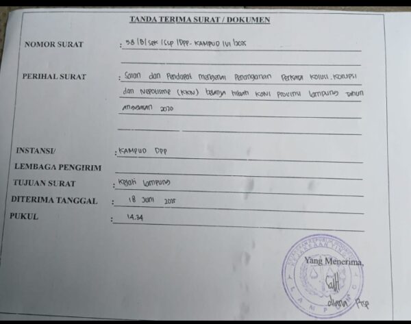 Untuk diketahui saran dan pendapat atas permintaan penetapan tersangka lain dari DPP KAMPUD tersebut didaftarkan ke kantor Kejati Lampung melalui bagian PTSP dan diterima oleh petugas bernama Diana.
