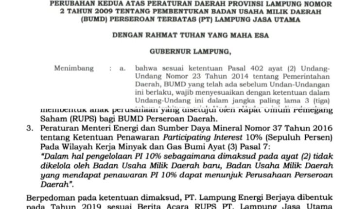 ” Sampai dengan saat ini tidak ada Perda yg dikeluarkan DPRD Provinsi Lampung ataupun Peraturan Gubernur Lampung yang mengatur soal PT.LEB sebagai pengelola Participacing Interest (PI) dan petunjuk teknis lainnya sesuai dengan peraturan yang berlaku, ” imbuh Johan Alamsyah.