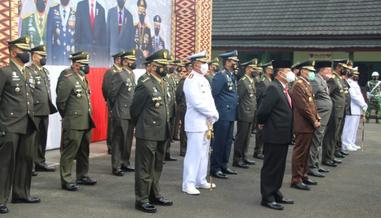 Bandar Lampung (MIN) – Kapolda Lampung Irjen Pol Hendro Sugiatno bersama Gubernur Lampung Arinal Djunaidi serta Forkopimda Provinsi Lampung mengikuti Upacara Hari Ulang Tahun Tentara Nasional Indonesia (HUT-TNI) ke-76 secara virtual, yang dipimpin langsung oleh Presiden Joko Widodo selaku Inspektur Upacara, di Halaman Makorem 043/Gatam, Bandar Lampung, Selasa (5/10).