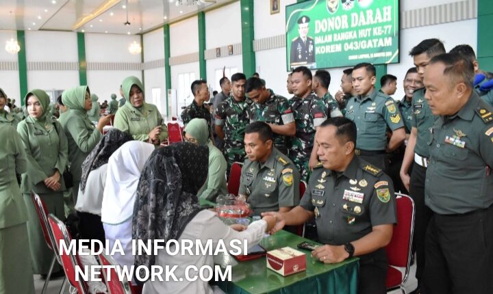 Lampung – Jelang Hari Ulang Tahun (HUT) Ke- 77 Korem 043/Gatam Tahun 2024, Korem 043/Gatam bekerjasama dengan PMI Cabang Provinsi Lampung menggelar kegiatan Bakti Sosial Donor Darah, yang diikuti 193 orang pendonor dan yang dapat mendonorkan darahnya sebanyak 84 orang, pada Rabu (28/08/2024).