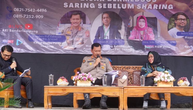 Bandar Lampung (MIN-SMSI) – Kabid Humas Polda Lampung, Kombes Pol Zahwani Pandra Arsad menjadi narasumber dialog interaktif luar studio yang diselenggarakan RRI Bandar Lampung, dengan tema, “Bijak Bermedsos, Saring Sebelum Sharing”.