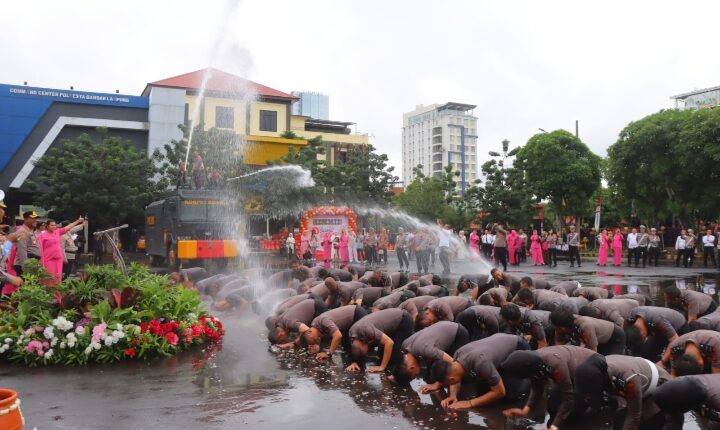 Para personel juga melakukan sujud syukur dan disiram dengan air menggunakan water canon. Tradisi unik ini digelar sebagai ucapan syukur anggota Kepolisian.