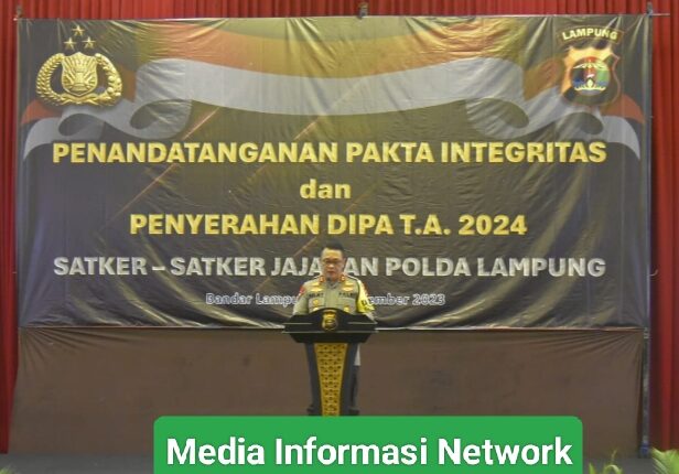 BANDAR LAMPUNG (Mi-Net) – Kapolda Lampung Irjen Pol Helmy Santika pimpin acara penyerahan DIPA Satker T.A. 2024 dan penandatanganan pakta Integritas tahun 2024 satker jajaran Polda Lampung.