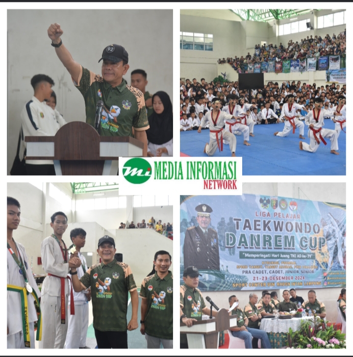 Lampung (Mi-Net) – Dalam rangka memperingati Hari Juang TNI AD Ke-79 Tahun 2024, Liga Pelajar Taekwondo Danrem Cup, secara resmi dibuka oleh Danrem 043/Gatam Brigjen TNI Rikas Hidayatullah, S.E., M.M., bertempat di Sport Center UIN Radin Inten, yang berada di Sukarame Bandar Lampung, Minggu (22/12/2024).