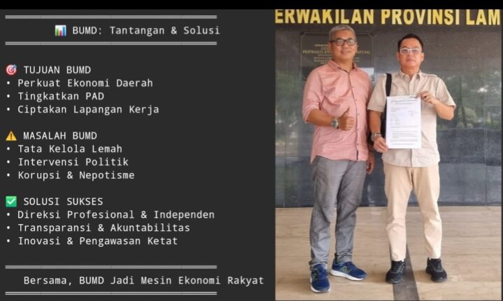 Bandar Lampung (MI-NET) — Potensi besar Badan Usaha Milik Daerah (BUMD) sering terancam gagal karena lemahnya pengawasan dan praktik pengelolaan yang tidak transparan.