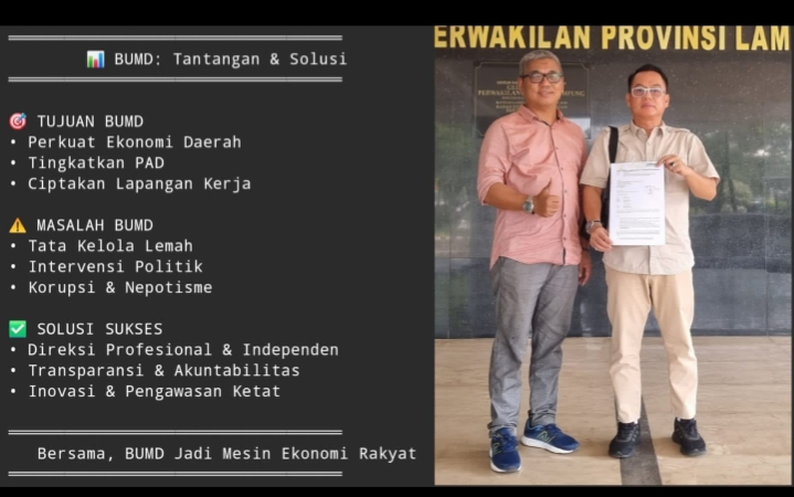 Bandar Lampung (MI-NET) — Potensi besar Badan Usaha Milik Daerah (BUMD) sering terancam gagal karena lemahnya pengawasan dan praktik pengelolaan yang tidak transparan.
