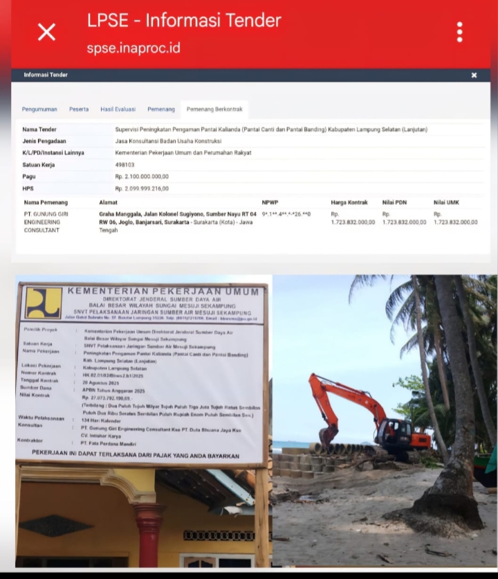 Bandar Lampung (MI-NET) – LSM Pro Rakyat menyoroti Konsultan Supervisi pada Proyek Peningkatan Pengamanan Pantai Canti dan Pantai Banding, Kecamatan Kalianda, Kabupaten Lampung Selatan yang dikerjakan dengan anggaran Rp 1,7 miliar dari pagu 2 milyar oleh kontraktor yang dipilih oleh Kementerian PUPR, PT. Gunung Giri Engineering Consultant beralamat di Surakarta Jawa Tengah.