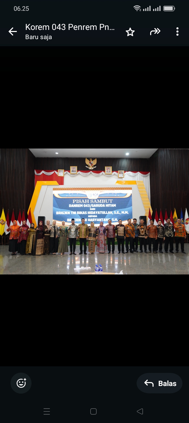 Lampung (MI-NET) – Pemerintah Provinsi Lampung menggelar malam pisah sambut Komandan Korem 043/Garuda Hitam (Gatam) dari pejabat lama Brigjen TNI Rikas Hidayatullah, S.E., M.M., kepada pejabat baru Brigjen TNI Haryantana, S.H.