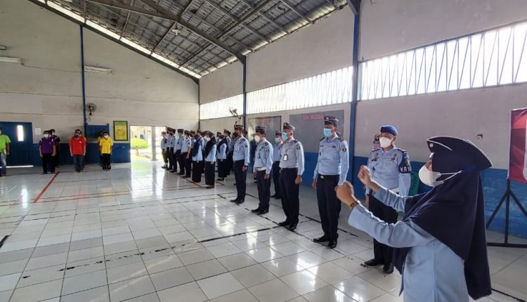 BANDAR LAMPUNG – Petugas Lapas Narkotika Kelas IIA Bandar Lampung bersama warga binaan pemasyarakatan (WBP) melakukan deklarasi bersama untuk pernyataan komitmen bebas dari Handphone, Pungli dan Narkoba (Halinar). Pernyataan deklarasi tersebut berlangsung di Aula Lapas Narkotika Bandar Lampung, Jumat (24/9/2021).