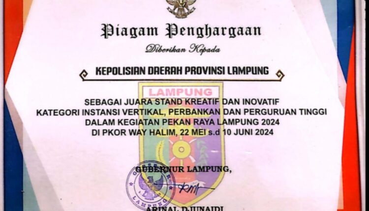 BANDARLAMPUNG – Polda Lampung berhasil meraih penghargaan sebagai Juara Stand Kreatif dan Inovatif dalam kategori Instansi Vertikal, Perbankan, dan Perguruan Tinggi pada ajang Pekan Raya Lampung 2024.