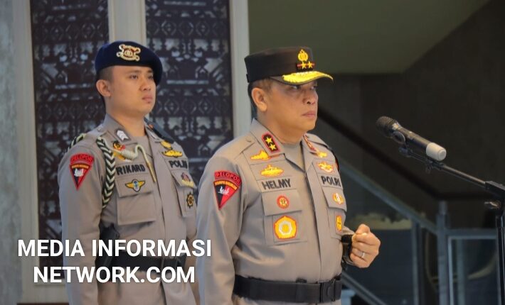Lampung Selatan – Kapolda Lampung Irjen Pol Helmy Santika S.H.,S.I.k.,M.Si., memimpin Upacara Pemuliaan Nilai-nilai Tri Brata dalam Rangka Pembinaan Tradisi Hari Bhayangkara yang ke-78 tahun 2024. bertempat di Siger Lounge Polda Lampung, Rabu (19/6/24).