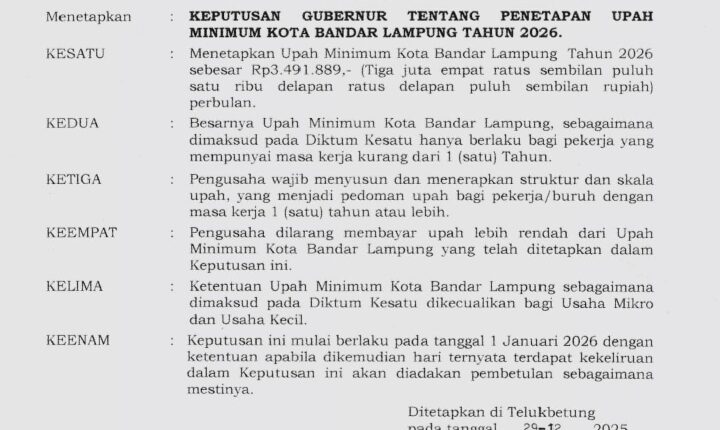 BANDAR LAMPUNG ) (MIN) – Pemerintah Provinsi Lampung secara resmi menetapkan Upah Minimum Kota (UMK) Bandar Lampung Tahun 2026 sebesar Rp3.491.889 per bulan. Penetapan tersebut tertuang dalam Keputusan Gubernur Lampung Nomor: G/881/V.08/HK/2025 tentang Penetapan Upah Minimum Kota Bandar Lampung Tahun 2026.