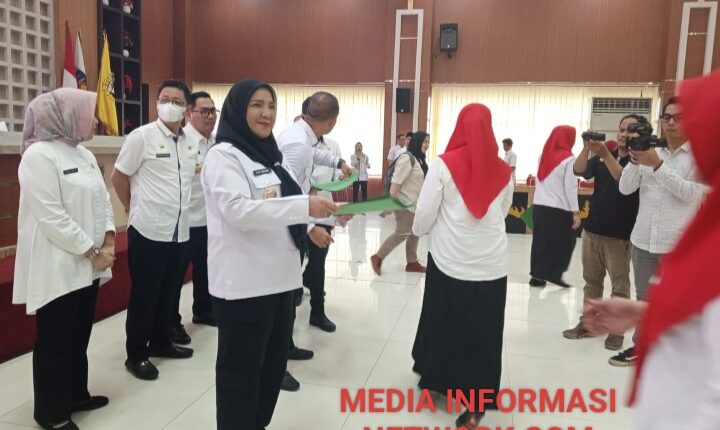 MEDIA INFORMASI NETWORK.COM — Walikota Bandar Lampung Hj. Eva Dwiana menyerahkan SK PPPK Formasi 2023 di Gedung Semergou, pada Rabu (24/4/2024).