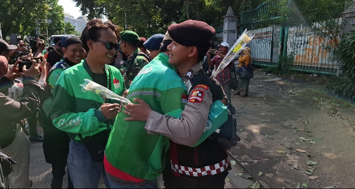 Bagikan Ribuan Mawar Untuk Anggota Polri dan TNI di Sekitar Monas, Komunitas Ojol Tidak Mau Terprovokasi