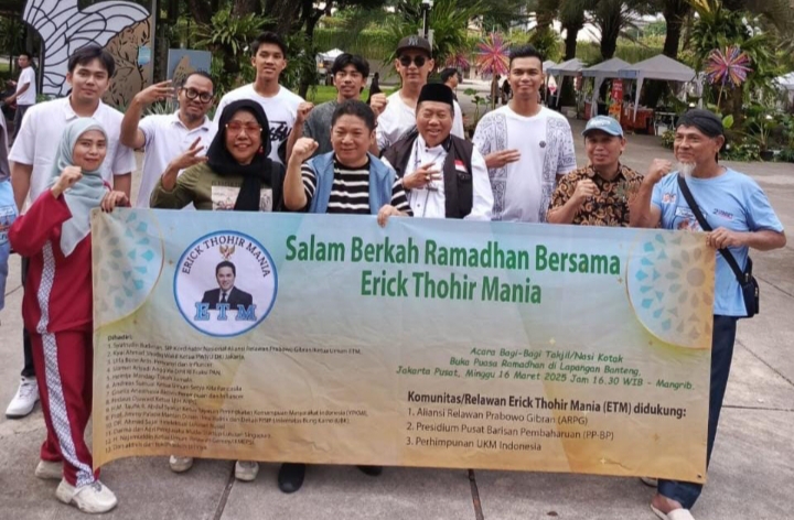 Jakarta (MI-NET) – Belasan aktivis komunitas Erick Thohir Mania (ETM) menggelar acara ‘Bagi-Bagi Takjil Salam Berkah Ramadhan” di Lapangan Banteng, Jakarta Pusat, Minggu sore (16/3/2025). Dipimpin Ketua Umum ETM Syafrudin Budiman, SIP dan beberapa relawan terpotret membagikan ratusan nasi kotak, kue takjil dan air mineral.