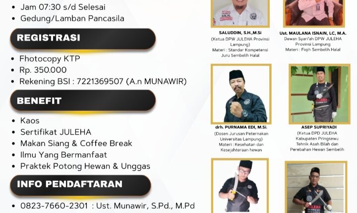 Fasilitas yang didapat Sertifikat Juleha, Materi, Makan Siang, Coffee Break, Praktek Potong Hewan & Unggas. Biaya konstribusi 350.000 rupiah per peserta. Pembayaran ditransfer ke rekening BSI a.n. Munawir, M.Pd. Pendaftaran dilakukan melalui tautan, https://forms.gle/sCMnXKXhMeKA9sZG.