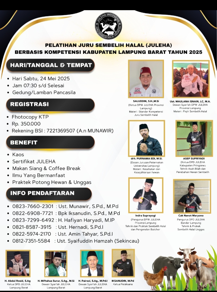 Lampung Barat (MI-NET) – DPD Juru Sembelih Halal (Juleha) Kabupaten Lampung Barat berkomitmen membangun dan memperkuat ekosistem halal. Hal ini akan diwujudkan dengan Pelatihan Juru Sembelih Halal (Juleha) Berbasis Kompetensi yang akan diadakan di Gedung atau Lamban Pancasila Komplek Pemda, pada Sabtu, 24 Mei 2025.