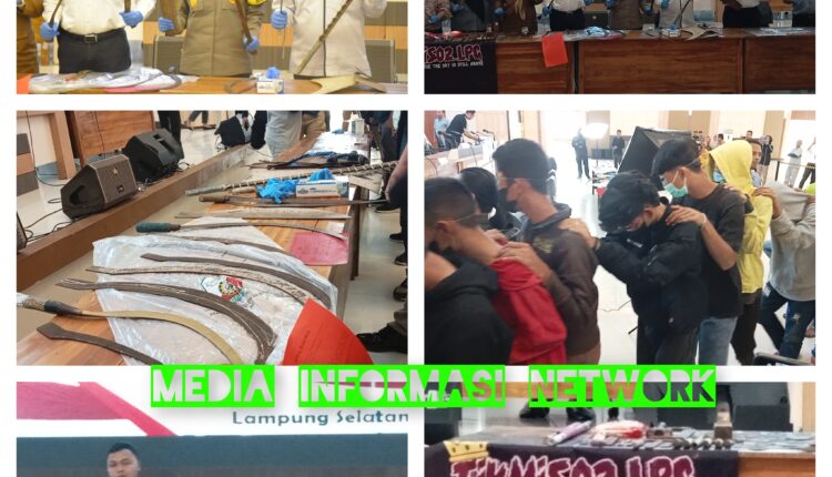 Lampung Selatan (MIN) – Polda Lampung menggelar konferensi pers mengenai penangkapan 30 (tiga puluh) remaja yang membawa senjata tajam yang diduga ingin melakukan tawuran, bertempat di Gedung Serba Guna (GSG) Presisi Polda Lampung, pada Senin (13/11/2023).