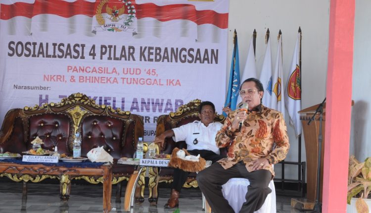 Anggota DPR/MPR RI Zulkifli Anwar memaparkan Empat Pilar Kebangsaan untuk mengingatkan kembali landasan kehidupan, sehari-hari, bermasyarakat, berbangsa dan bernegara yang terdiri dari empat landasan ideologi (Pancasila), Undang-Undang Dasar 1945, Negara Kesatuan Republik Indonesia (NKRI) dan Bhineka Tunggal Ika.