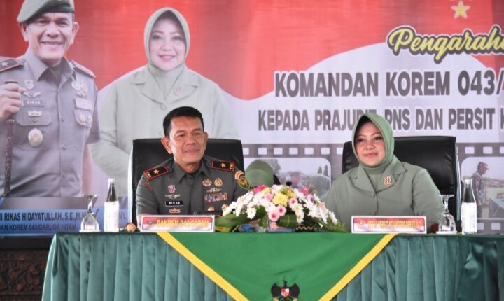 Lampung – Komandan Korem 043/Gatam Brigjen TNI Rikas Hidayatullah, S.E., M.M., didampingi Ketua Persit Kartika Chandra Kirana Koorcab Rem 043 PD II/Swj Ny. Hanny Rikas Hidayatullah, beserta rombongan melaksanakan kunjungan kerja di Kodim 0411/KM, yang berada di Jl. Veteran, Kelurahan Hadimulyo Barat, Kecamatan Metro Pusat, Kota Metro, pada Kamis (25/07/2024).