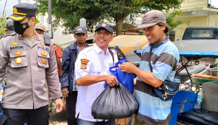 Lampung Timur (MIN-SMSI) — Polres Lampung Timur, Polda Lampung, bersama mahasiswa, Tokoh Agama, LSM Laskar Merah Putih, Pemuda Pancasila dan Kelompok Sadar (Pokdar) Kamtibmas, bagikan bantuan sosial (bansos) berupa ratusan paket sembako.