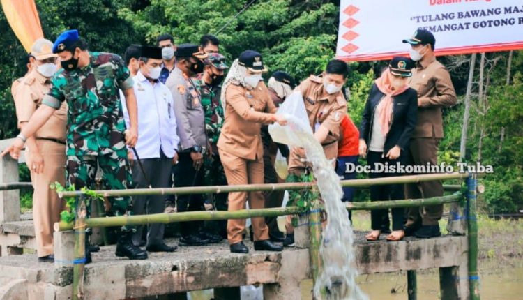 Tulang Bawang (MIN-SMSI) – Tebar benih ikan nila Nirwana di tangga raja sungai Tulang Bawang dilaksanakan ibu bupati Tulang Bawang Dr.Hj.Winarti,SE.MH. dalam rangka menyambut HUT Kabupaten Tulang Bawang ke-25 tahun 2022, Selasa (01/03/2022).