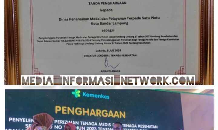 BATAM — Dinas Penanaman Modal dan Pelayanan Terpadu Satu Pintu (DPMPTSP) Kota Bandar Lampung merupakan salah satu yang menerima penghargaan Penyelenggara Perizinan Tenaga Medis dan Tenaga Kesehatan sesuai UU Nomor 17 Tahun 2023 tentang Kesehatan dan Surat Edaran Menteri Kesehatan Nomor HK.02.01/MENKES/6/2024 tentang Peyelenggaraan Perizinan Tenaga Medis dan Tenaga Kesehatan sesuai UU Nomor 17 Tahun 2023, di Batam Selasa (09/07/2024).