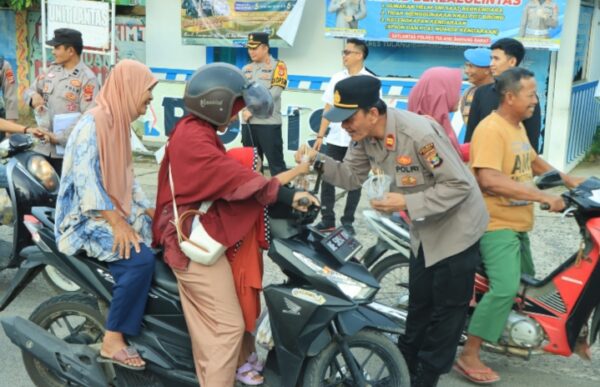 Dalam kegiatan tersebut, 50 puluh paket takjil makan ringan dan es buah dibagikan kepada masyarakat sekitar Polres Tubaba