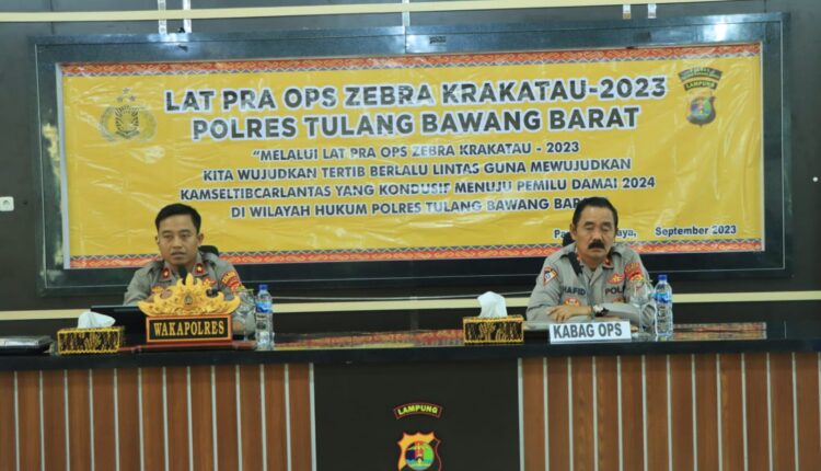 Tulang Bawang Barat (MIN) — Menjelang akan dimulainya Operasi Zebra Zebra Krakatau 2023, Jajaran Polres Tulang Bawang Barat Polda Lampung melaksanakan Latihan Pra Operasi atau Lat Pra Ops bagi personel yang terlibat dalam operasi tersebut. Lat Pra Ops ini dilaksanakan di Aula Mapolres Tulang Bawang Barat, Sabtu (2/9/2023) pagi.