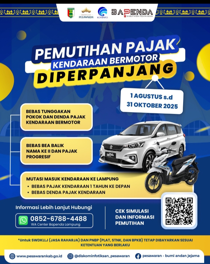 Pesawaran (MI-NET) — Kabar baik bagi para pemilik kendaraan bermotor di Kabupaten Pesawaran. Pemerintah Provinsi Lampung resmi memperpanjang masa pemutihan pajak kendaraan bermotor hingga 31 Oktober 2025, sesuai dengan Surat Keputusan Gubernur Nomor G/503/VI.03/HK/2025 tentang Perpanjangan Masa Pembebasan Pokok Tunggakan dan Denda Pajak Kendaraan Bermotor, Rabu (6 Agustus 2025).