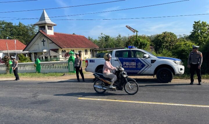 Pesawaran (MI-NET) – Dalam upaya menjaga ketertiban dan keamanan masyarakat serta menjamin kelancaran arus lalu lintas, Satuan Lalu Lintas (Satlantas) Polres Pesawaran melaksanakan kegiatan pengamanan ibadah Minggu umat Kristen di Gereja GPIB Immanuel, Kecamatan Gedong Tataan, Kabupaten Pesawaran, Minggu (08/06/2025).