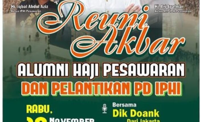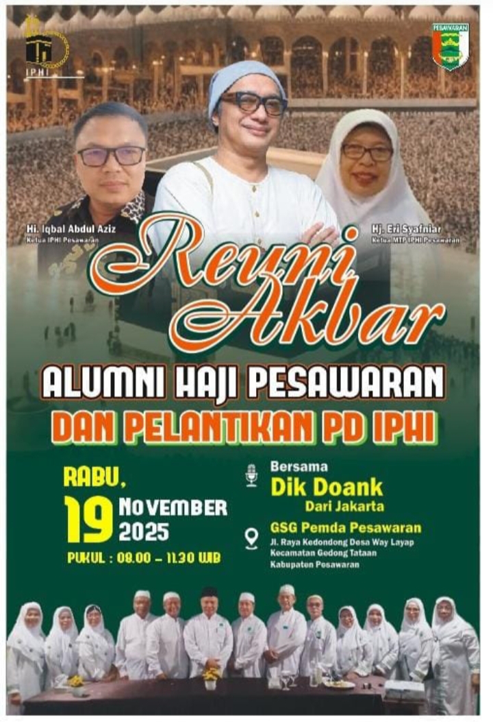 PESAWARAN (MIN) – Pengurus Daerah Ikatan Persaudaraan Haji Indonesia (PD IPHI) Kabupaten Pesawaran terus mematangkan persiapan menjelang gelaran Reuni Akbar dan Pelantikan Pengurus PD IPHI Pesawaran periode 2025–2030 yang akan digelar pada 19 November 2025 di Gedung Serba Guna (GSG) Pesawaran. Acara tersebut rencananya turut menghadirkan artis nasional sekaligus pendiri Sekolah Alam Indonesia, Dik Doank, sebagai tamu kehormatan.