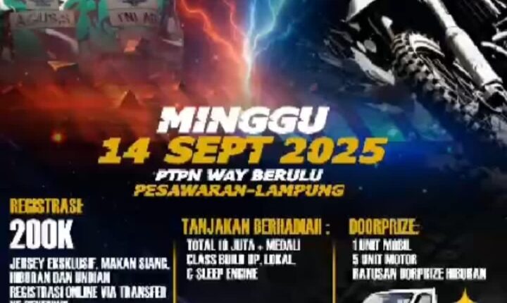 Lampung (MI-NET) – Dalam Rangka memperingati Hari Ulang Tahun (HUT) Tentara Nasional Indonesia (TNI) yang ke-80, ribuan rider bakal meramaikan Trail Advanture 2025 untuk merebut hadiah panglima TNI yang akan digelar pada Minggu 14 September 2025 di PTPΝ Way Berulu Pesawaran-Lampung.