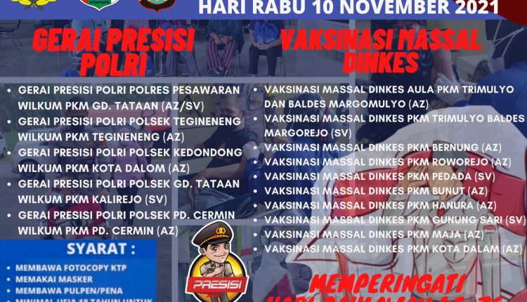 AdventorialNewsPesawaran Jadwal Vaksinasi Covid-19, Rabu 10 November 2021 Wilayah Hukum Polres Pesawaran By Suryanto Last updated Nov 10, 2021 0 26 Share Dalam Rangka Memperingati Hari Pahlawan Ke-76, Mari Kita Sama² Ramaikan & Datangi Tempat² Vaksinasi Bagi yg Belum Vaksin, Guna Mewujudkan Herd Imunity Yang Kuat 0 26 Share FacebookTwitterGoogle+ReddItWhatsAppPinterestEmail