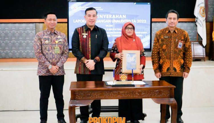 Pesawaran (MiN) – Bupati Pesawaran H. Dendi Ramadhona St. M.Tr. I.P. sampaikan Laporan Keuangan Pemerintah Daerah (LKPD) Tahun Anggaran 2022 kepada BPK RI Perwakilan Provinsi Lampung di Aula Kantor BPK Perwakilan Provinsi Lampung, Jum’at (17/03/23).