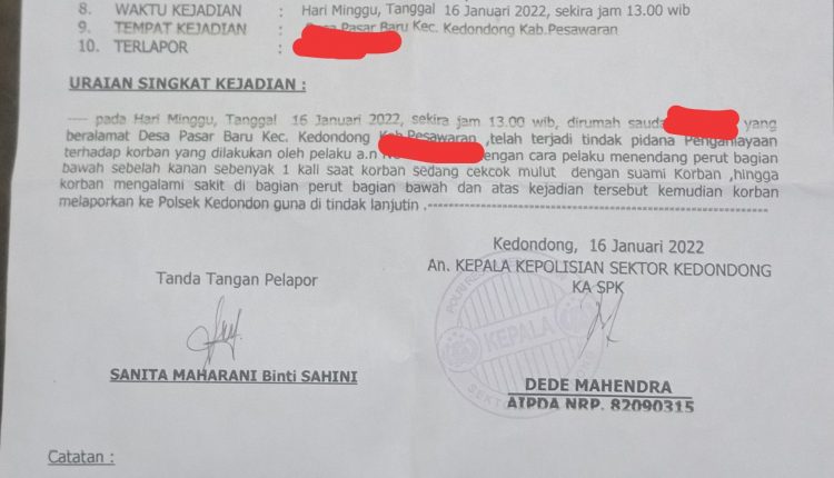 Untuk diketahui bahwa Sanita Maharani diduga telah dianiaya oleh (NA) pada 16 Januari 2022 yang lalu, dan dirinya langsung melaporkannya ke Polsek Kedondong dengan Nomor : LP/ B-21/I/2022/SPK/POLDA LAMPUNG/RES PESAWARAN/ SEK KEDONDONG . (Sur/Koes).