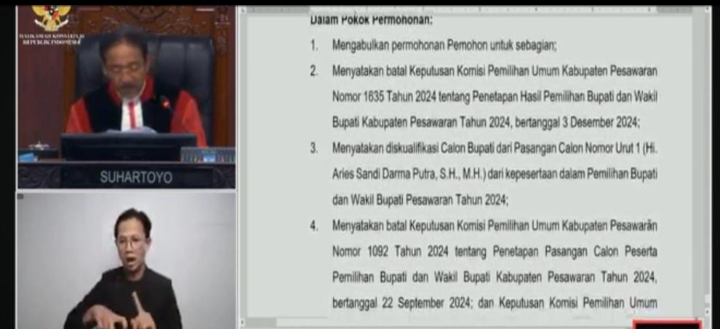 “Bahwa berdasarkan pertimbangan hukum terkait SKPI paket/kesetaraan diatas, Mahkamah berpendapat Aries Sandi Darma Putra tidak memenuhi syarat pencalonan sebagai bupati, dan juga Mahkamah sebagai pengadil terakhir menyatakan surat keputusan Komisi Pemilihan Umum (KPU) nomor 1635 tahun 2024 tentang penetapan hasil pemilihan bupati dan wakil bupati Pesawaran dibatalkan,” ujarnya saat membacakan putusan.