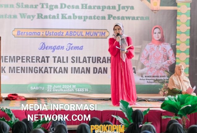 Pesawaran – Ketua Himpunan Majelis Taklim (HMT) Kabupaten Pesawaran Nanda Indira bersilaturahmi dengan Pengurus Himpunan Majelis Taklim (HMT) tingkat kecamatan dan desa serta masyarakat di Kecamatan Way Ratai, Sabtu (29/6/24).