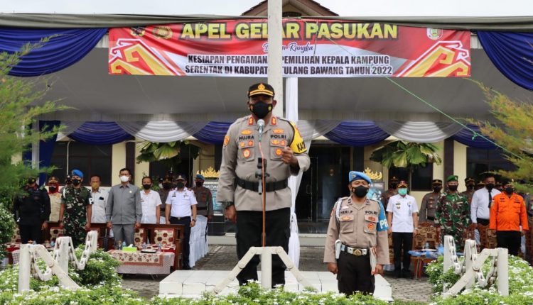 Tulang Bawang (MIN – SMSI) – Dalam rangka pengecekan terhadap personel yang terlibat dalam pengamanan baik TNI, Polri maupun elemen masyarakat, serta kelengkapan sarana dan prasarana (sarpras) pada pelaksanaan Pemilihan Kepala Kampung (Pilkakam) serentak tahun 2022, Polres Tulang Bawang melaksanakan Apel Gelar Pasukan Operasi Sai Bumi Nengah Nyappur 2022.
