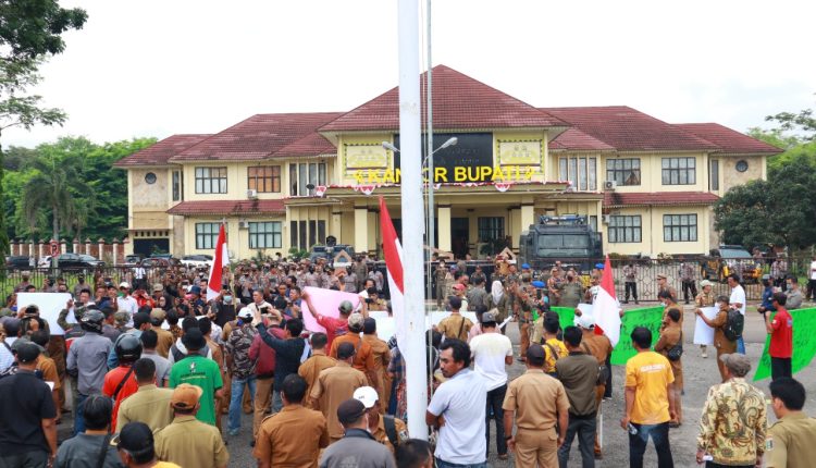 Lampung Timur (MIN-SMSI) – Ratusan Personil Polres Lampung Timur Polda Lampung, melaksanakan pengamanan unjuk rasa yang dilakukan perangkat Desa di Kantor Bupati Lampung Timur dan Gedung DPRD Kabupaten Lampung Timur, Senin (11/9/2022).