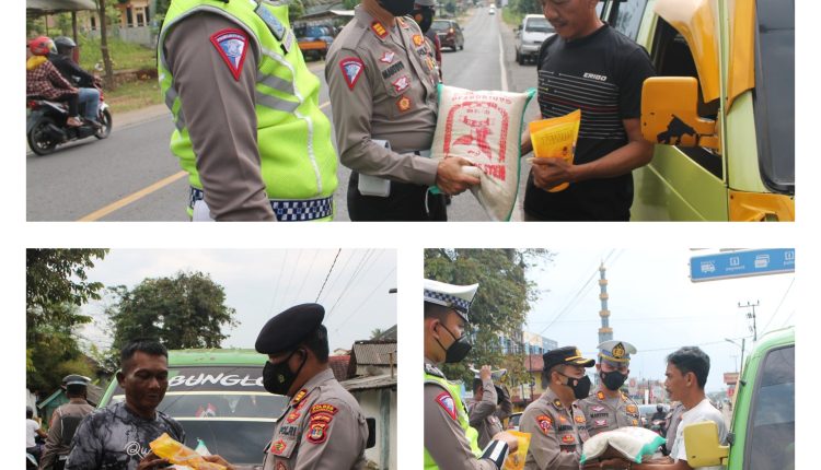 Pesawaran (MIN-SMSI) – Satlantas Polres Pesawaran memberikan sosialisasi terkait kenaikan harga Bahan Bakar Minyak (BBM) sekaligus membagikan paket Sembako kepada sopir angkutan umum (Angkot) yang melintas di Jalan Lintas Barat Gedong Tataan, Kabupaten Pesawaran, Kamis (08/09/22).